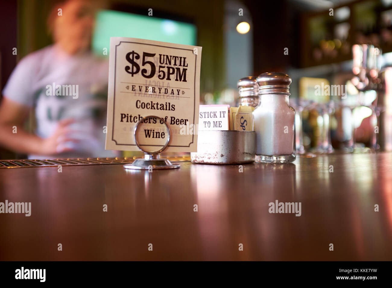 Sign In A Pub Advertising Cheap Drinks Until Five In A Low Angle View Over A Wooden Counter Top Stock Photo Alamy
